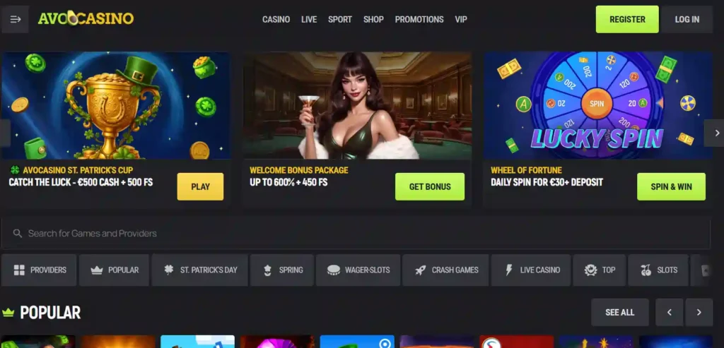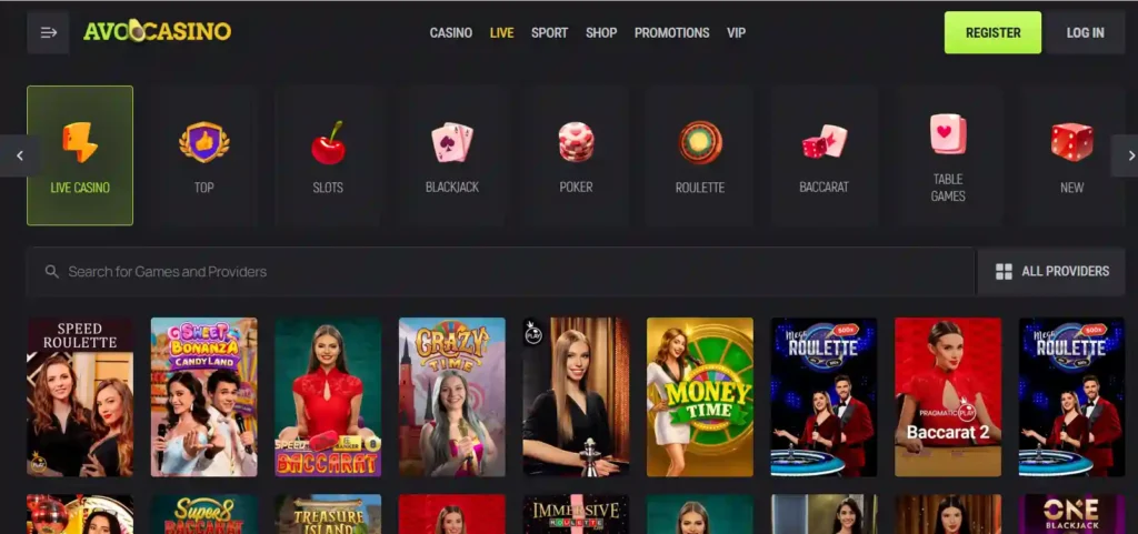 Avocasino offers thousands of casino games and slots from over 75 leading providers including NetEnt, Pragmatic Play, Evolution Gaming, Nolimit City, Playtech, Yggdrasil, Red Tiger Gaming, Betsoft and Big Time Gaming, covering video slots, classic slots, progressive jackpots, table games (roulette, blackjack, baccarat), video poker, live dealer casino, crash games, bingo, keno, scratch cards, virtual sports and eSports betting.