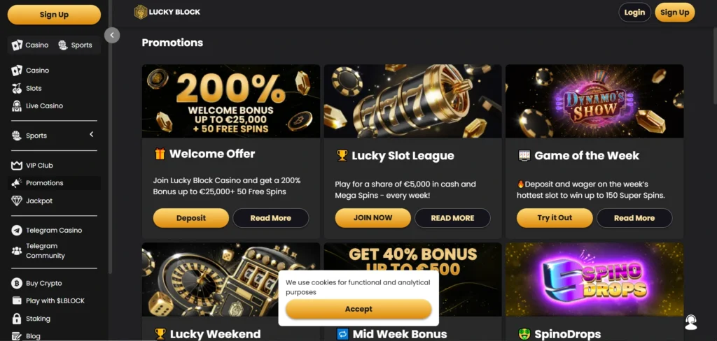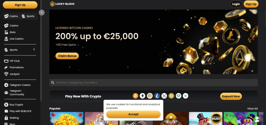 Lucky Block Casino is a licensed Bitcoin and crypto casino platform offering thousands of gamesโincluding slots, live casino, table games, crash/instant titles like Plinko and Mines, pokerโand full sports betting coverage. It provides a prominent 200% welcome bonus up to โฌ25,000 plus 50 free spins on deposits starting from โฌ20, with support for over 20 cryptocurrencies (Bitcoin, Ethereum, Tether, Dogecoin, Solana, and more) for instant deposits and fast withdrawals. Key highlights include provably fair gameplay, strong security features, mobile-friendly design, and Telegram casino integration for easy access. Additional perks feature VIP rewards with cashback, free spins, exclusive tournaments, and a loyalty program.