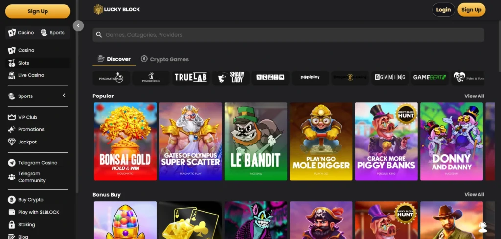 Lucky Block Casino offers a massive library of casino games, with thousands of titles focused heavily on slots (thousands available, including high-RTP, Megaways, Bonus Buy, Drops & Wins, and crypto jackpot slots), alongside live casino, table games, crash/instant games, and poker.