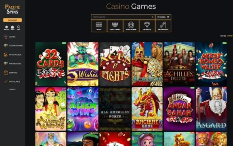 Pacific Spins offers a solid selection of casino games powered mainly by RealTime Gaming (RTG) and Spinlogic Gaming. The focus is on RNG-based titles—no live dealer games are available.