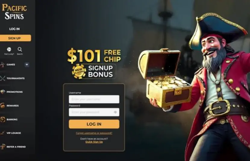 Pacific Spins Casino, launched in 2023, is a pirate-themed online platform powered exclusively by RealTime Gaming (RTG/SpinLogic). It boasts a diverse game library including hundreds of slots, table games (blackjack, roulette, baccarat), video poker, and progressive jackpots. Major highlights: $125 no-deposit bonus, crypto payments (Bitcoin), fast withdrawals, USA-friendly access, Anjouan license, tournaments, and mobile compatibility.